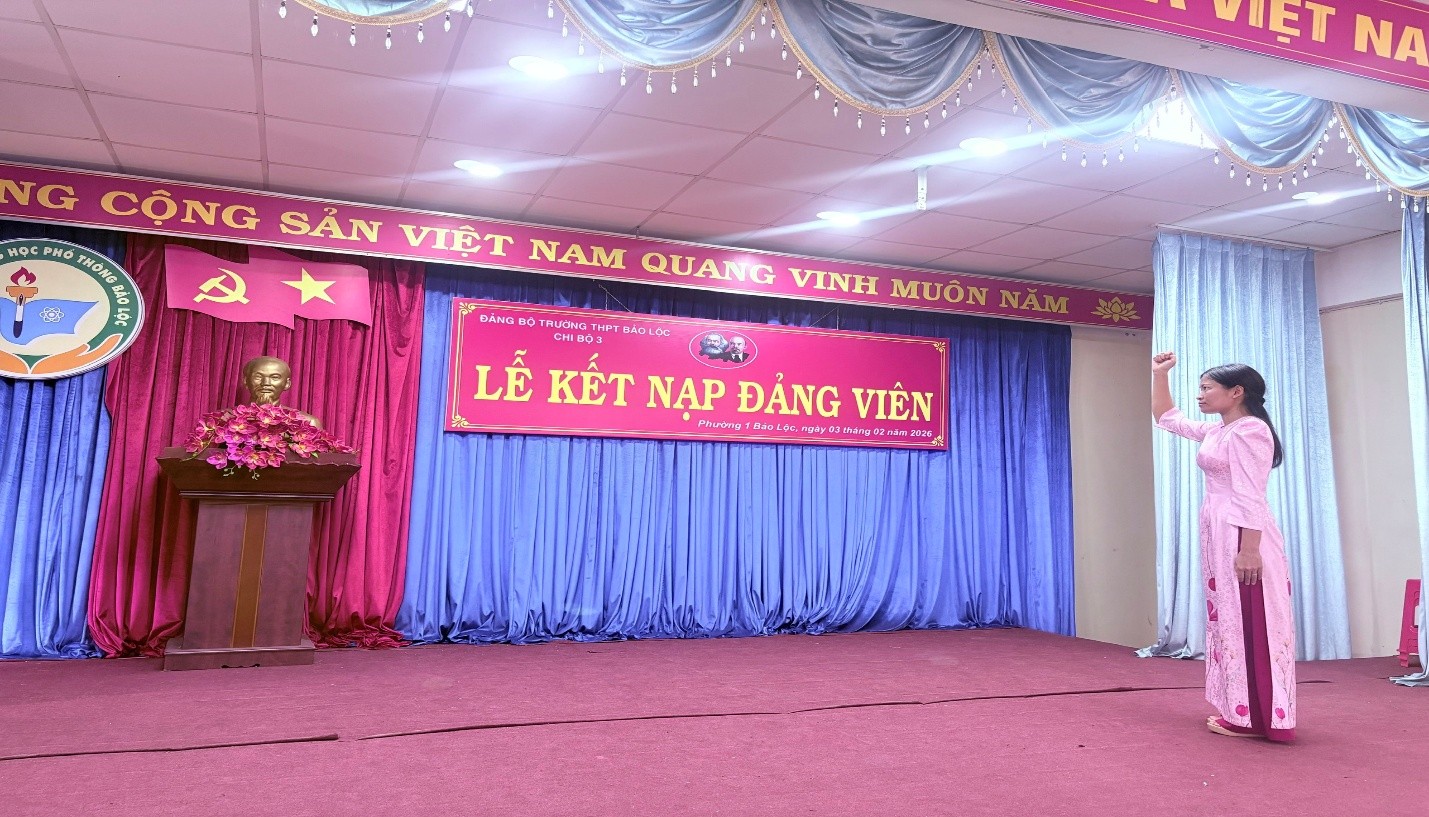 Thực hiện Quyết định số: 159-QĐ/ĐU, ngày 29/01/2026 của Đảng ủy phường 1 Bảo Lộc về việc kết nạp đảng viên, được sự nhất trí của Đảng ủy trường THPT Bảo Lộc, chiều ngày 03/02/2026, Chi bộ 3 – Đảng bộ Trường THPT Bảo Lộc long trọng tổ chức Lễ kết nạp đảng viên mới cho quần chúng ưu tú Phạm Thị Nga – Phó Bí thư Đoàn trường, giáo viên bộ môn Vật Lý vào hàng ngũ của Đảng Cộng sản Việt Nam. Buổi lễ diễn ra trong không khí trang nghiêm, đúng trình tự, thủ tục theo Điều lệ Đảng.