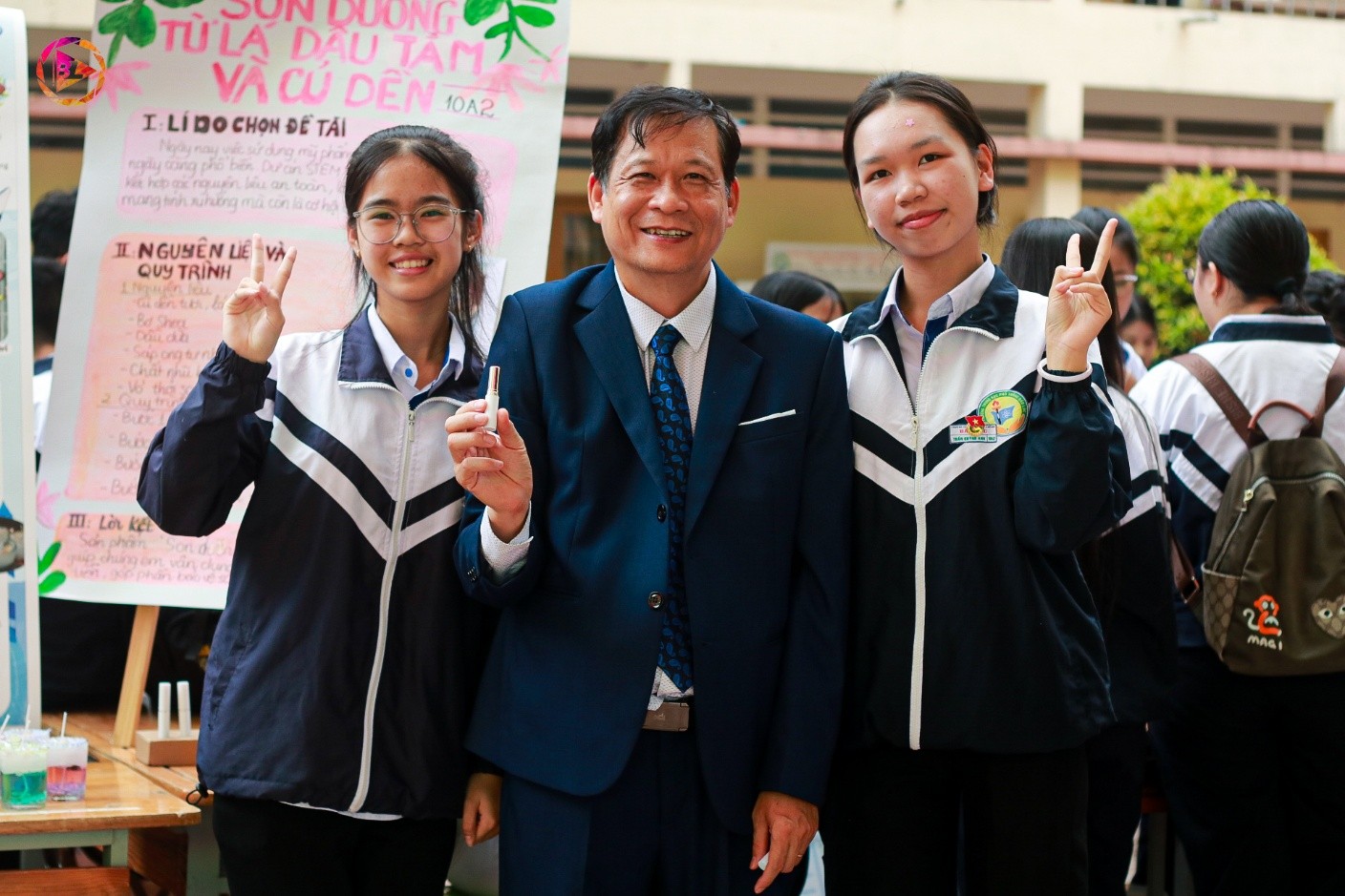 Các bạn học sinh lớp 10A2 rạng rỡ bên sản phẩm son dưỡng tự nhiên - một ý tưởng sáng tạo xanh mang dấu ấn cá nhân tại ngày hội.