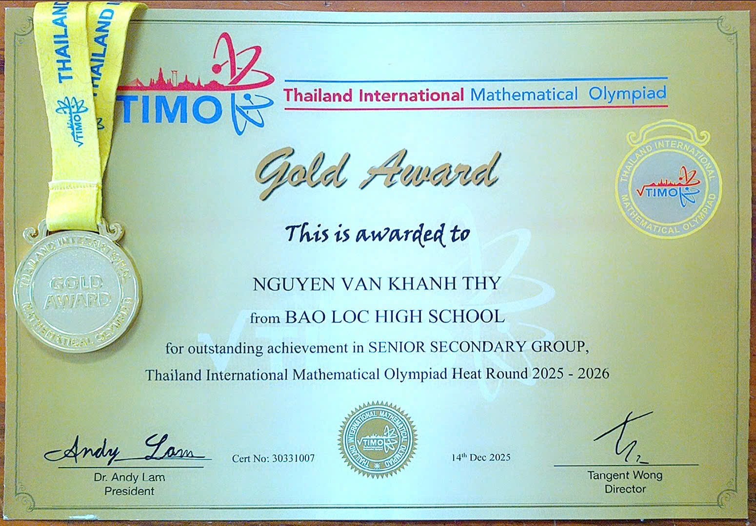 NỮ SINH TRƯỜNG THPT BẢO LỘC GIÀNH HUY CHƯƠNG VÀNG TẠI KỲ THI TOÁN HỌC QUỐC TẾ TIMO 2025 -2026