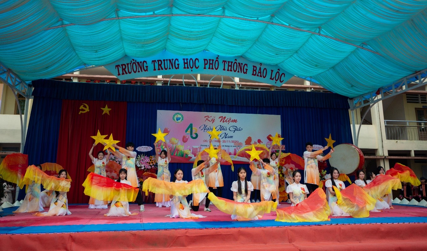 Trong phần tri ân, nhà trường gửi tặng hoa đến các thầy cô giáo về hưu – những người đã góp phần đặt nền móng xây dựng trường THPT Bảo Lộc như hôm nay. Ấn tượng nhất trong buổi lễ là chương trình nghệ thuật với chủ đề “NGHỀ GIÁO TÔI YÊU” do tập thể HĐSP nhà trường thể hiện. Các ca khúc “Về lại mái trường xưa”; “Em vẫn như ngày xưa – Mặt trời bé con”; Liên khúc “Nhớ ơn thầy cô – Bụi phấn – Con đường đến trường – Nghề giáo tôi yêu” đã lắng lại như một lời thổ lộ chân thành về tình yêu nghề, yêu học trò, yêu từng trang giáo án còn thơm mùi phấn trắng. Giai điệu vang lên giữa sân trường buổi sáng se lạnh của phố núi khiến nhiều người không giấu được xúc động. Chương trình văn nghệ không chỉ là buổi biểu diễn thường niên mà còn là dịp để các thầy cô thêm thấu hiểu giá trị nghề nghiệp, nuôi dưỡng tình yêu với bục giảng, và để học trò gửi đến thầy cô mình lòng biết ơn trọn vẹn nhất.
