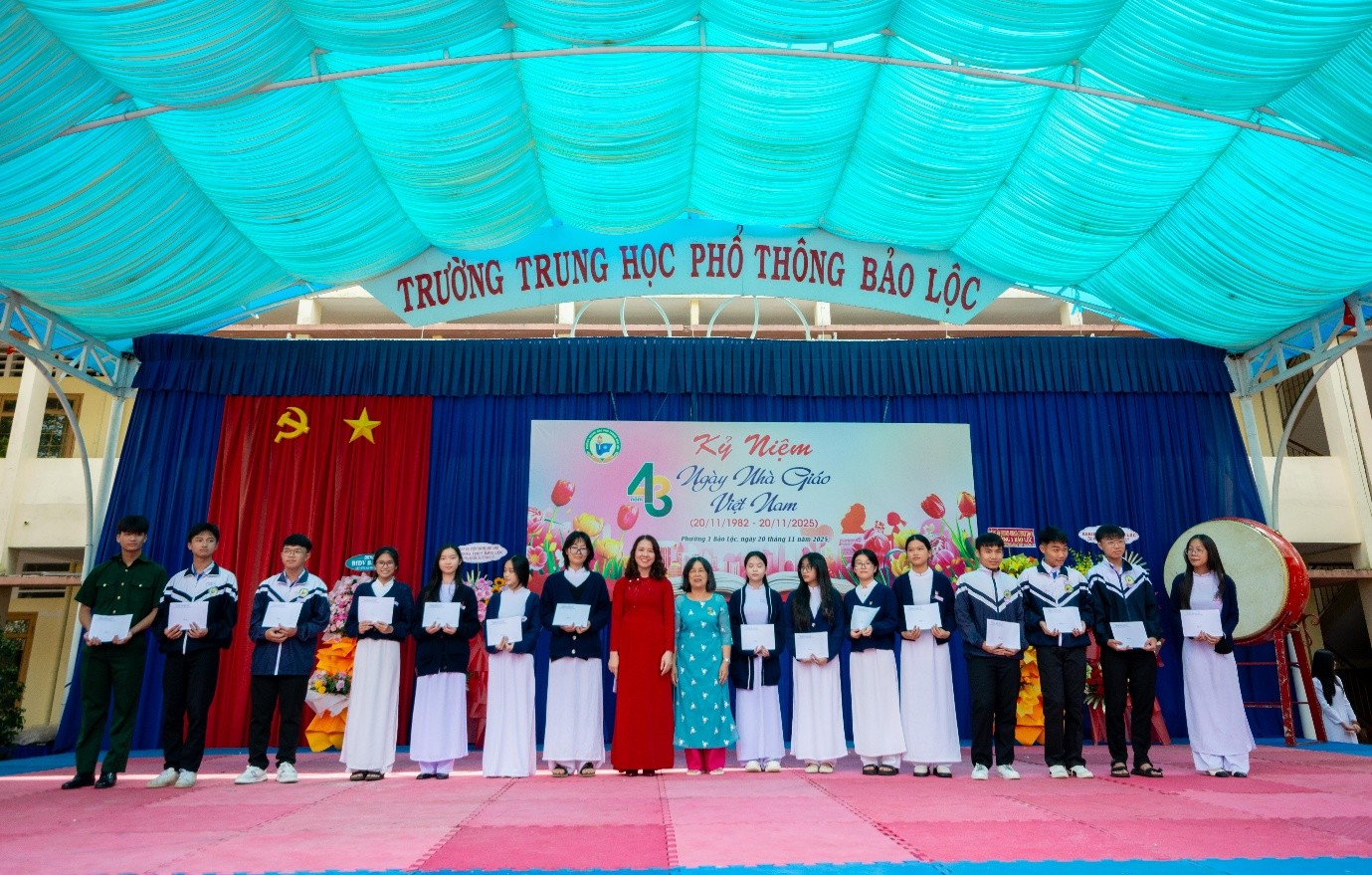 Trong khuôn khổ buổi lễ, nhà trường đã trao: 02 kỉ niệm chương Vì sự phát triển của tỉnh Lâm Đồng cho cô Bùi Thị Quốc Nga và thầy Nguyễn Hữu Khoa nguyên là Hiệu trưởng Trường THPT Bảo Lộc; khen thưởng các thầy, cô đạt thành tích xuất sắc trong Phong trào thi đua đợt 1; trao 49 suất học bổng cho các em có hoàn cảnh khó khăn. Những phần quà ý nghĩa góp phần động viên tinh thần học sinh, khích lệ tinh thần hiếu học và sẻ chia trong cộng đồng giáo dục.
